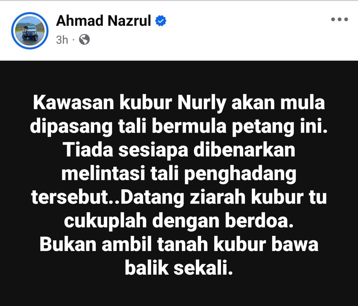 Dari FB Ahmad Nazrul memaklumkan petang tadi, tali pengadang telah siap dipasang di sekitar kubur Nurly.